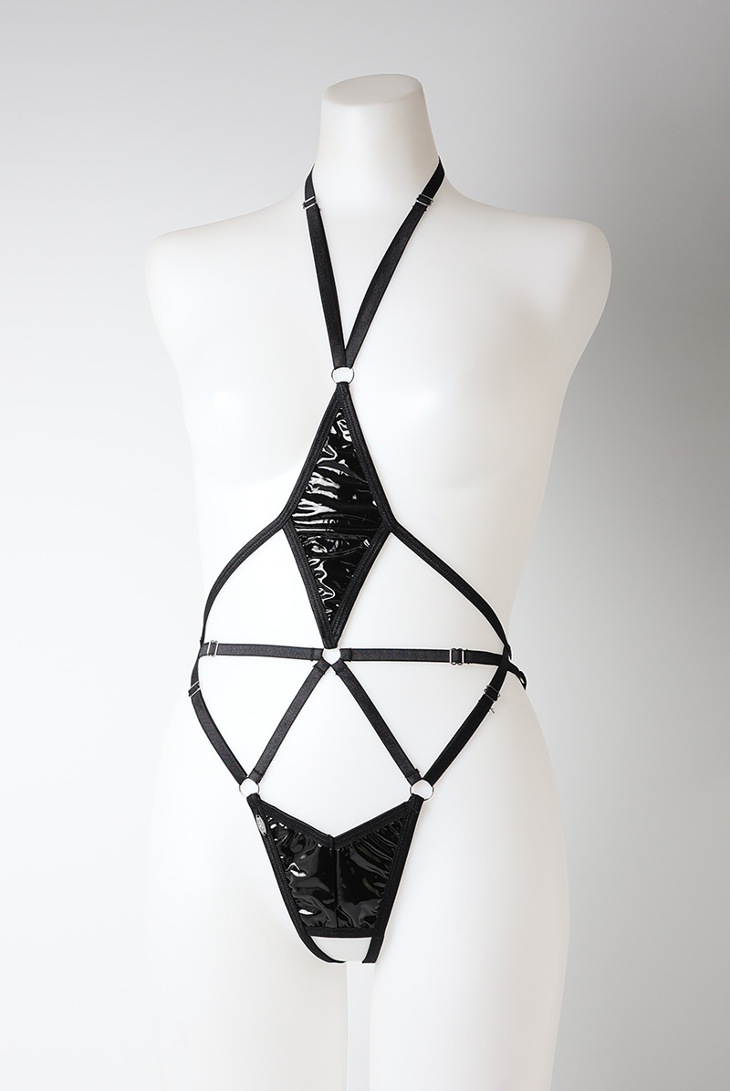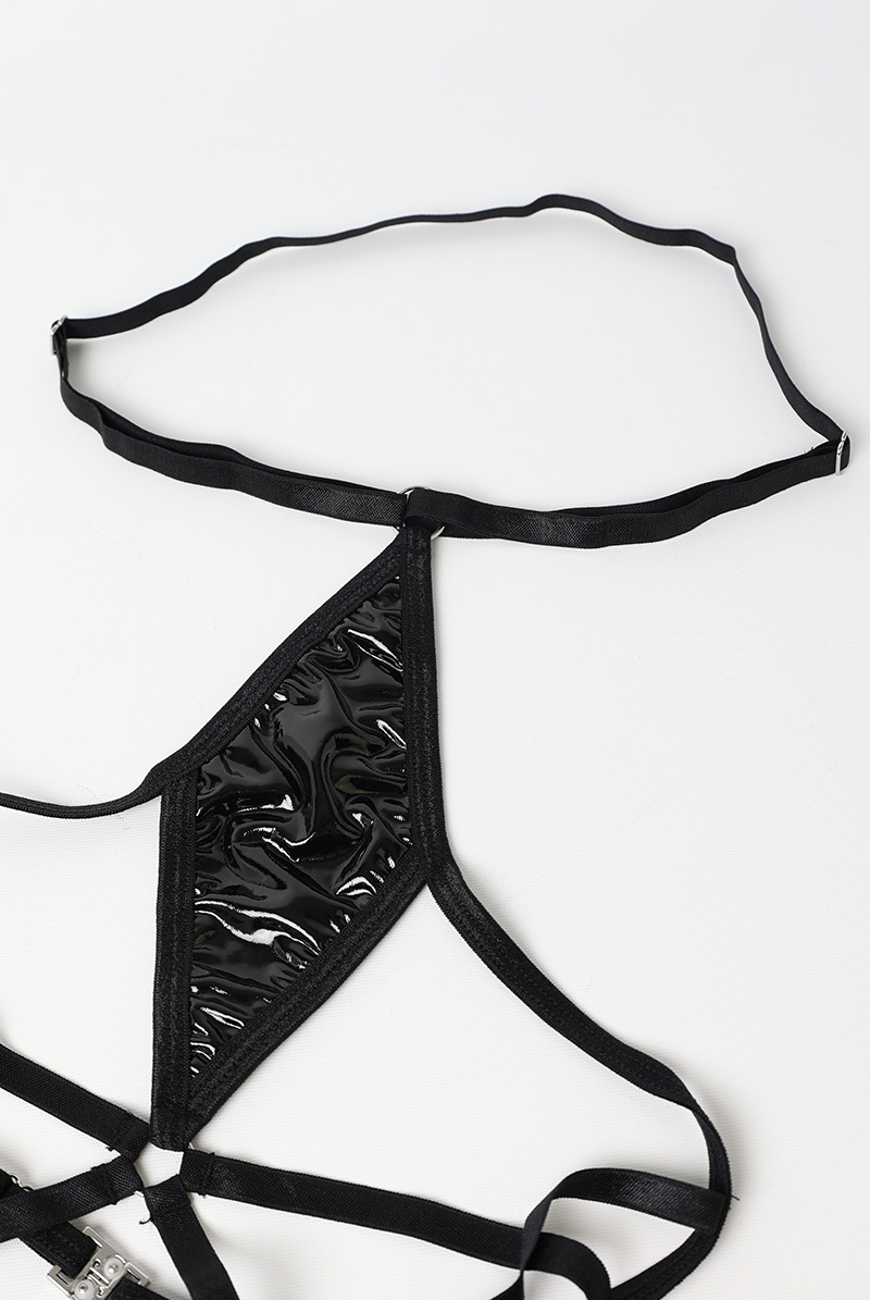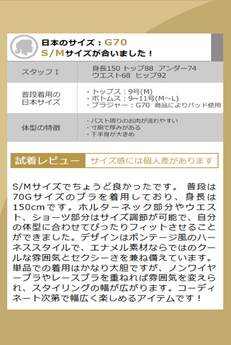 S/Mサイズでちょうど良かったです。 普段は70Gサイズのブラを着用しており、身長は150cmです。ホルターネック部分やウエスト、ショーツ部分はサイズ調節が可能で、自分の体型に合わせてぴったりフィットさせることができました。デザインはボンテージ風のハーネススタイルで、エナメル素材ならではのクールな雰囲気とセクシーさを兼ね備えています。単品での着用はかなり大胆ですが、ノンワイヤーブラやレースブラを重ねれば雰囲気を変えられ、スタイリングの幅が広がります。コーディネート次第で幅広く楽しめるアイテムです!
