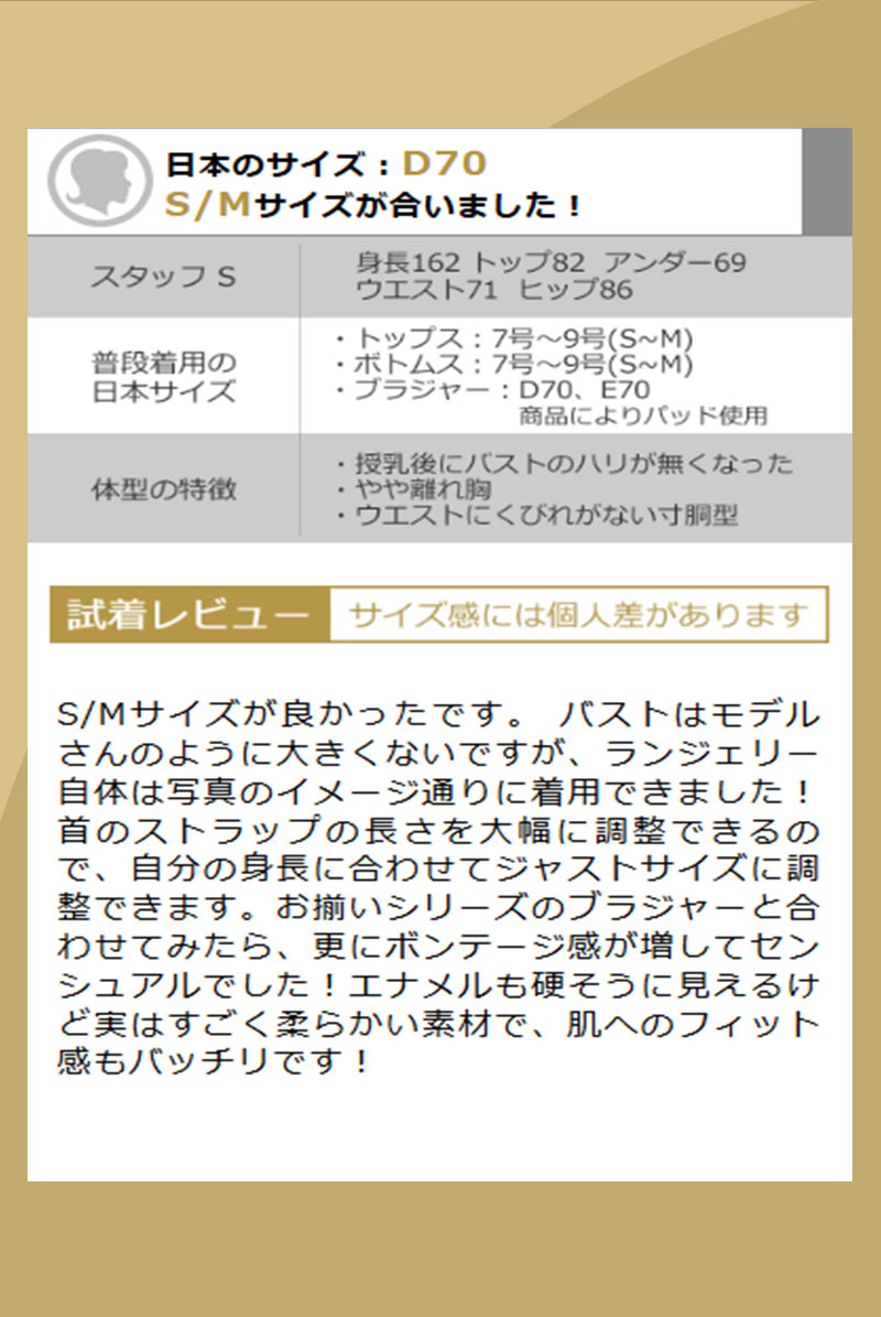 S/Mサイズが良かったです。 バストはモデルさんのように大きくないですが、ランジェリー自体は写真のイメージ通りに着用できました!首のストラップの長さを大幅に調整できるので、自分の身長に合わせてジャストサイズに調整できます。お揃いシリーズのブラジャーと合わせてみたら、更にボンテージ感が増してセンシュアルでした!エナメルも硬そうに見えるけど実はすごく柔らかい素材で、肌へのフィット感もバッチリです!