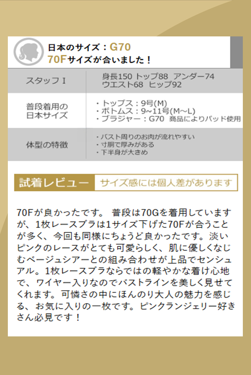 70Fが良かったです。 普段は70Gを着用していますが、1枚レースブラは1サイズ下げた70Fが合うことが多く、今回も同様にちょうど良かったです。淡いピンクのレースがとても可愛らしく、肌に優しくなじむベージュシアーとの組み合わせが上品でセンシュアル。1枚レースブラならではの軽やかな着け心地で、ワイヤー入りなのでバストラインを美しく見せてくれます。可憐さの中にほんのり大人の魅力を感じる、お気に入りの一枚です。ピンクランジェリー好きさん必見です!