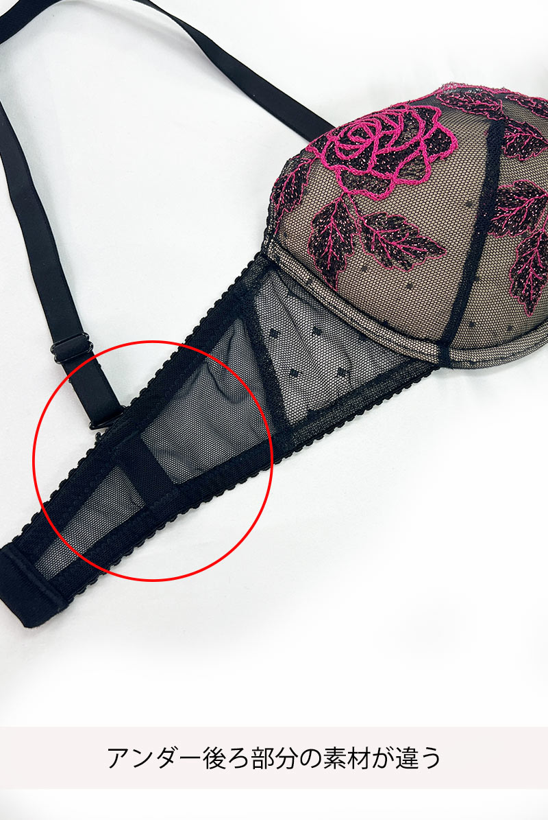 サテンを思わせるしっとりとした質感のチュールレースに淡いピンクのフローラル刺繍を乗せたプッシュアップブラジャー。大輪の花々がデコルテを飾る大胆なルックスが視線を奪います。胸元を彩る格子状のレースもデザインのポイントに。センターやサイドに配したシアーなレースが肌を透かす官能的かつスタイリッシュなランジェリーをお楽しみください。 バストをしっかりとリフトアップしてくれるカップは取り外し可能なパッド入り。手持ちのパッドをプラスすることもできるので、とびきりセクシーなデコルテでパートナーを惑わせたい日にもおすすめです。