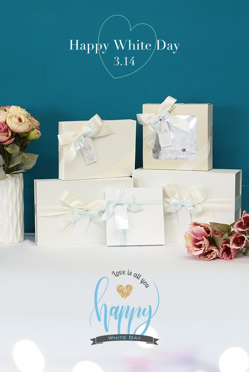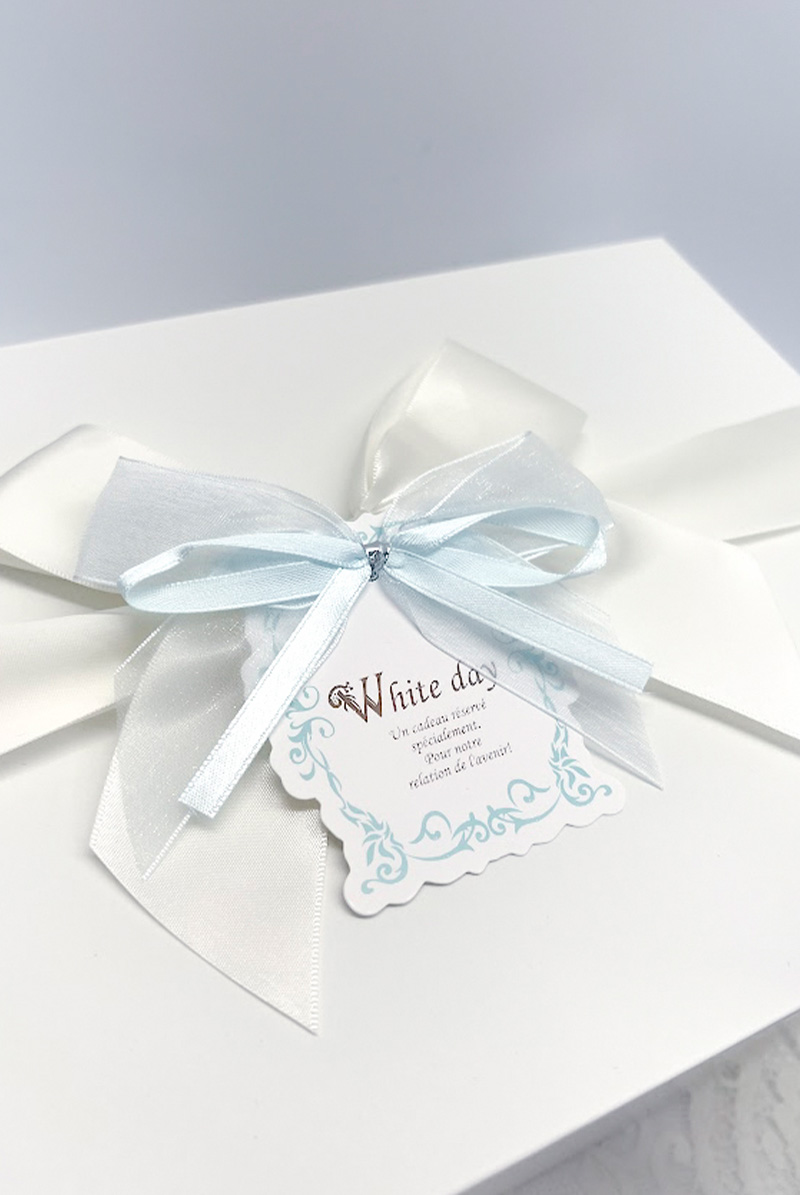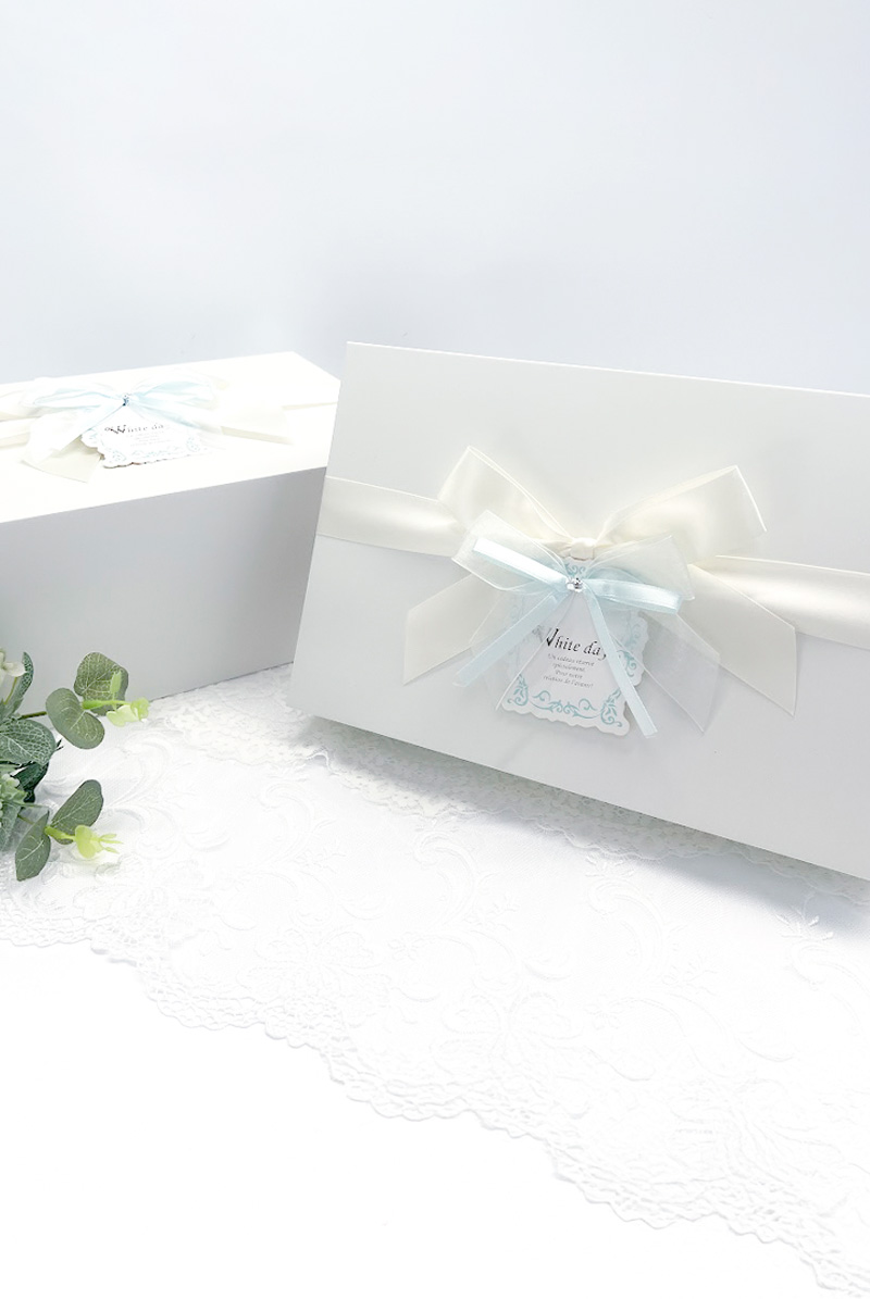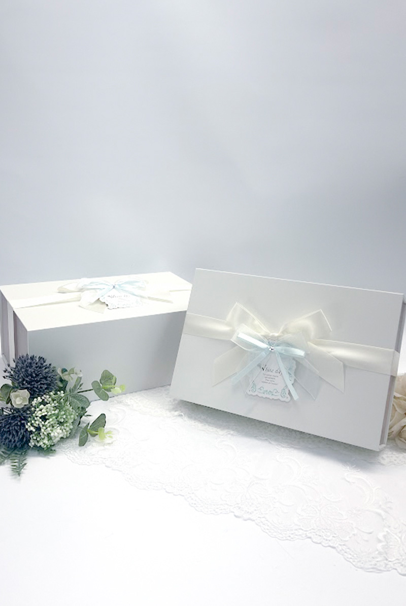 洗練されたホワイトボックス。深型と浅型の2種類がございますが、サイズはご指定いただけません。当店にお任せください。オリジナルのショッパー紙袋をもれなくお付けします。