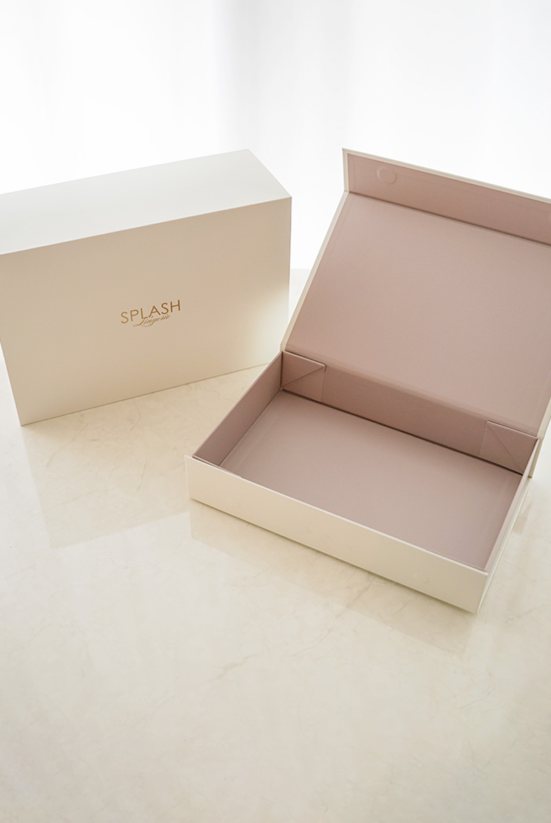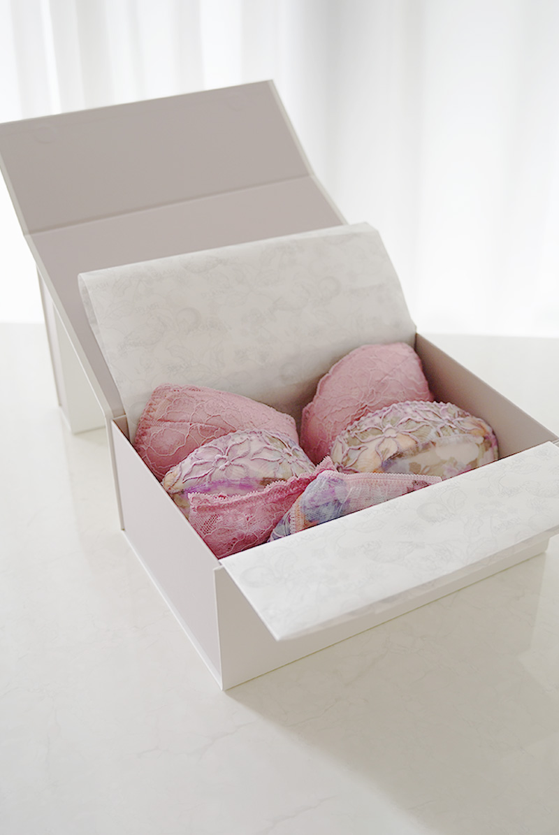 当店オリジナルのギフト専用クローゼットBOXは、捨てずに収納ボックスとして再利用が可能。光沢のある白リボンで高級ランジェリーに相応しいハイクラス感を演出します。