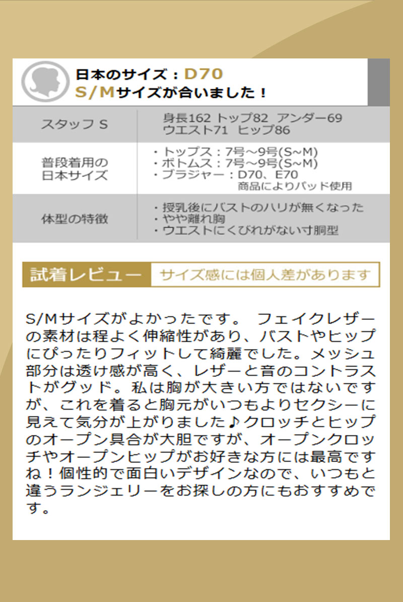 S/Mサイズがよかったです。 フェイクレザーの素材は程よく伸縮性があり、バストやヒップにぴったりフィットして綺麗でした。メッシュ部分は透け感が高く、レザーと音のコントラストがグッド。私は胸が大きい方ではないですが、これを着ると胸元がいつもよりセクシーに見えて気分が上がりました♪クロッチとヒップのオープン具合が大胆ですが、オープンクロッチやオープンヒップがお好きな方には最高ですね!個性的で面白いデザインなので、いつもと違うランジェリーをお探しの方にもおすすめです。