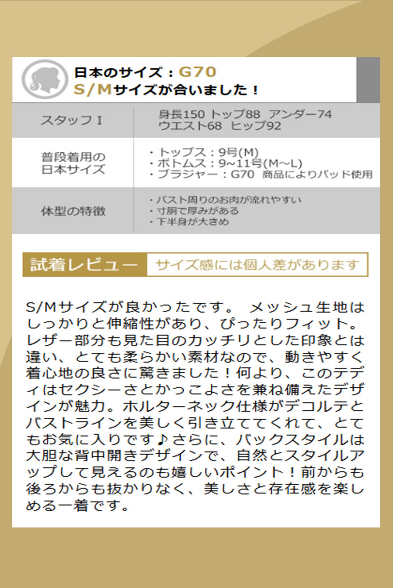 S/Mサイズが良かったです。 メッシュ生地はしっかりと伸縮性があり、ぴったりフィット。レザー部分も見た目のカッチリとした印象とは違い、とても柔らかい素材なので、動きやすく着心地の良さに驚きました!何より、このテディはセクシーさとかっこよさを兼ね備えたデザインが魅力。ホルターネック仕様がデコルテとバストラインを美しく引き立ててくれて、とてもお気に入りです♪さらに、バックスタイルは大胆な背中開きデザインで、自然とスタイルアップして見えるのも嬉しいポイント!前からも後ろからも抜かりなく、美しさと存在感を楽しめる一着です。