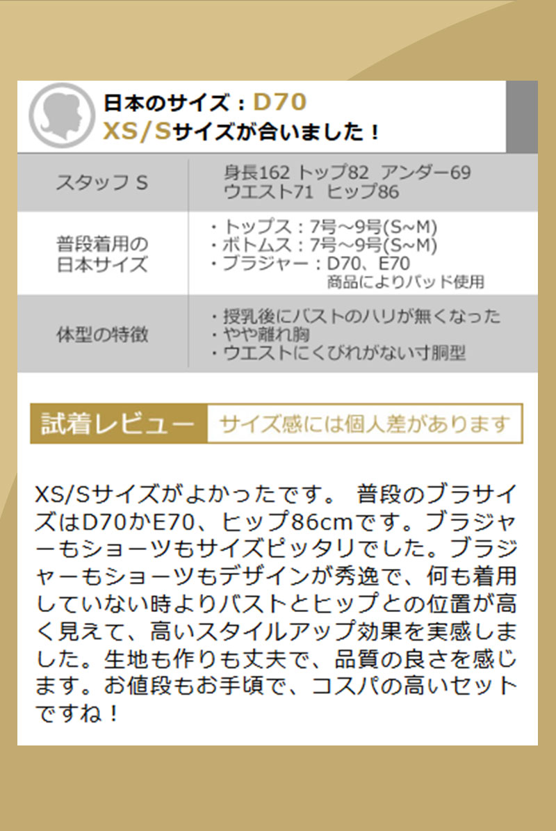 XS/Sサイズがよかったです。 普段のブラサイズはD70かE70、ヒップ86cmです。ブラジャーもショーツもサイズピッタリでした。ブラジャーもショーツもデザインが秀逸で、何も着用していない時よりバストとヒップとの位置が高く見えて、高いスタイルアップ効果を実感しました。生地も作りも丈夫で、品質の良さを感じます。お値段もお手頃で、コスパの高いセットですね!