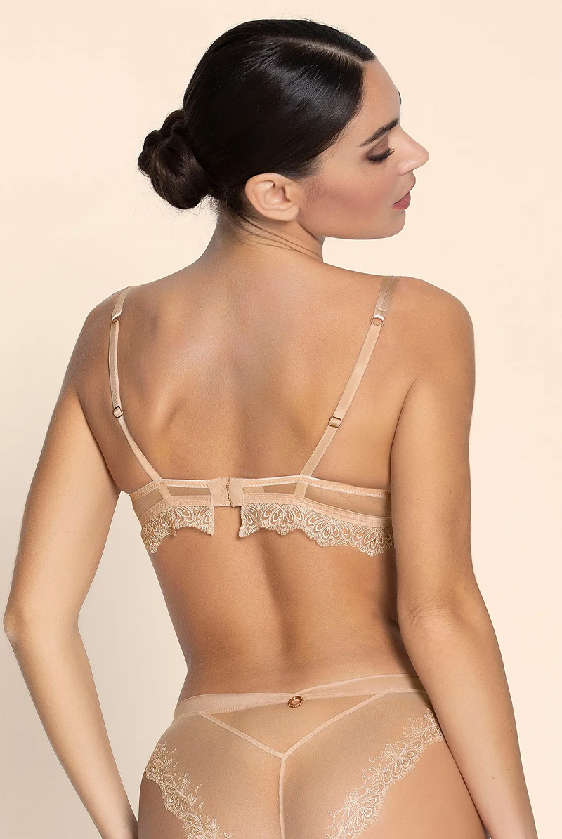 芸術作品のような繊細な美しさを纏う、エレガントなランジェリーコレクション。 ヌードとパールの2色の糸で表現されたイタリア製マルチスレッド刺しゅうが、肌の上でやわらかな陰影を生み出し、立体感のある華やかな表情を描きます。