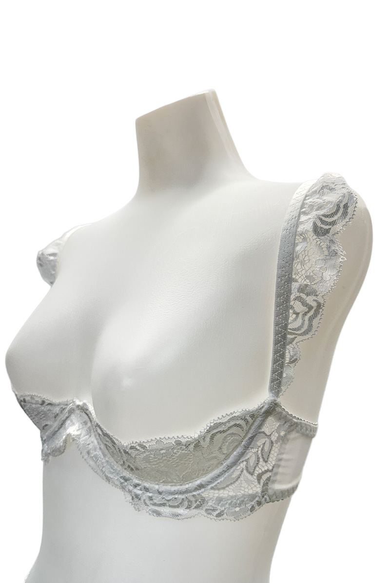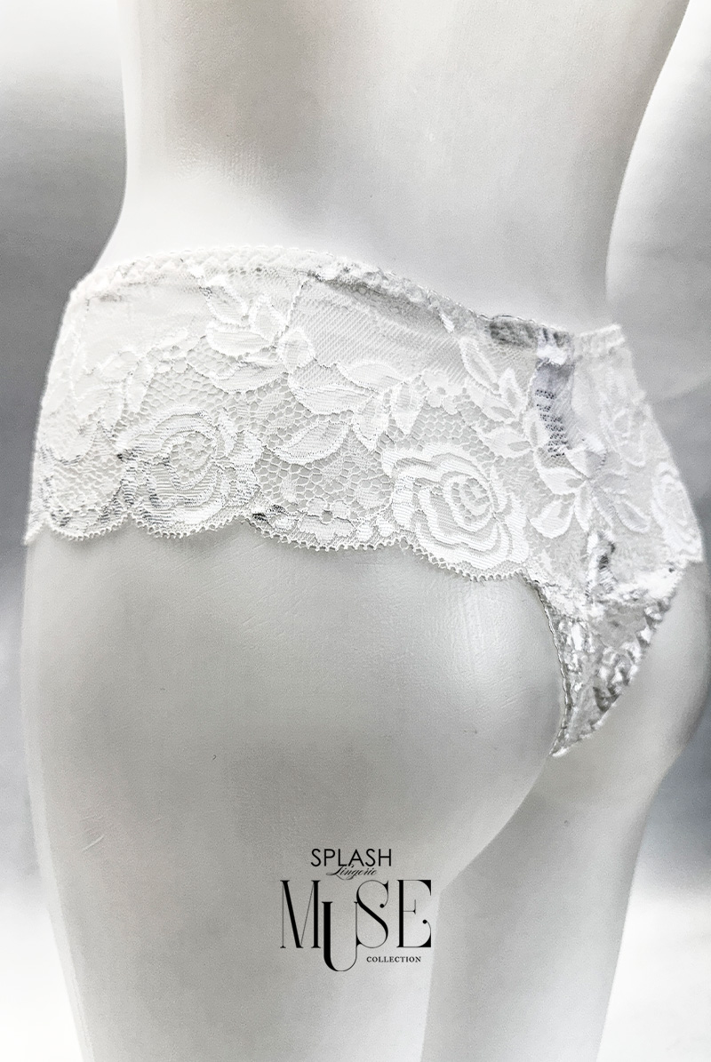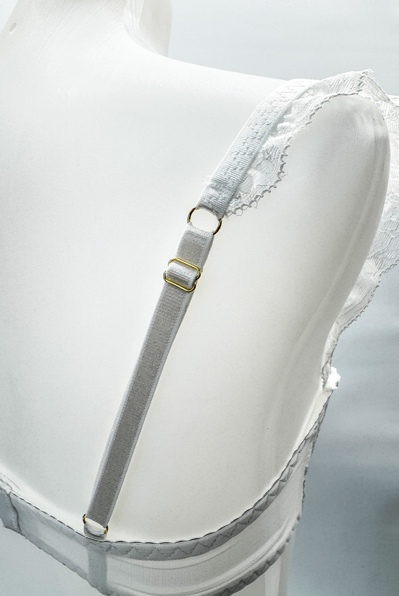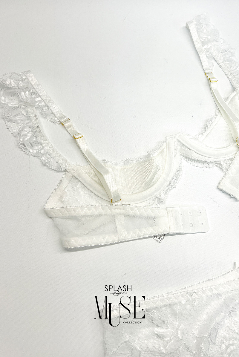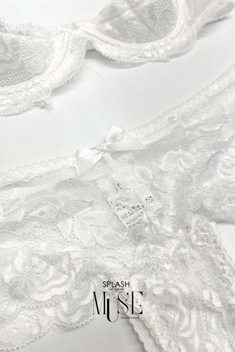 “混沌と微笑みの女神”という神話的イメージを宿すシリーズ 「Eris(エリス)」。危うさと可愛らしさがせめぎ合う、その魅惑的な世界観を白レースに閉じ込めたランジェリーコレクションです。ブラカップとショーツのクロッチにはあえて布を配さず、繊細なレースだけで構成。無垢な白の可憐さの裏に潜む、ほんの少し危ういセンシュアリティが肌の上で静かに花開きます。