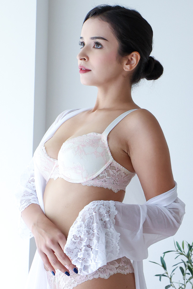 やわらかに頬を染める春の光をイメージした「BLUSH」。 清楚なオフホワイトに、淡く色づくピンクの刺繍を重ねた、優美でロマンティックなシリーズです。使用しているのは、繊細な柄行きが美しいヨーロッパ製の高級レース。軽やかでありながら奥行きのある表情が、肌にのせた瞬間ふわりと華やぎを添えます。甘さの中に品を宿したデザインは、大人の女性にこそ似合う一着。春の装いにそっと忍ばせたくなる、特別感あふれるコレクションです。