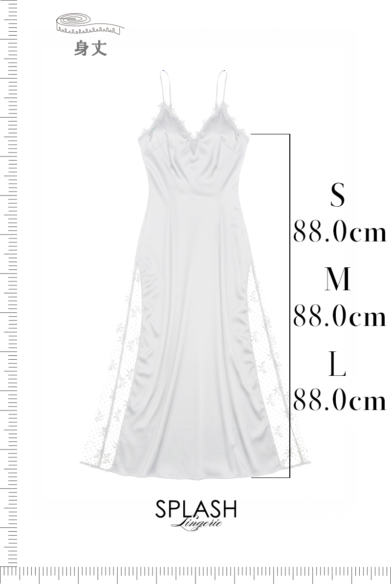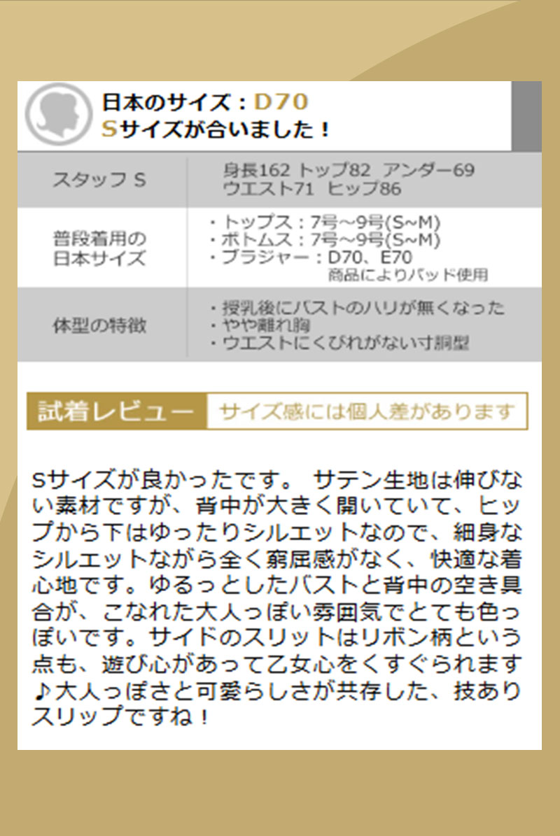 Sサイズが良かったです。 サテン生地は伸びない素材ですが、背中が大きく開いていて、ヒップから下はゆったりシルエットなので、細身なシルエットながら全く窮屈感がなく、快適な着心地です。ゆるっとしたバストと背中の空き具合が、こなれた大人っぽい雰囲気でとても色っぽいです。サイドのスリットはリボン柄という点も、遊び心があって乙女心をくすぐられます♪大人っぽさと可愛らしさが共存した、技ありスリップですね!