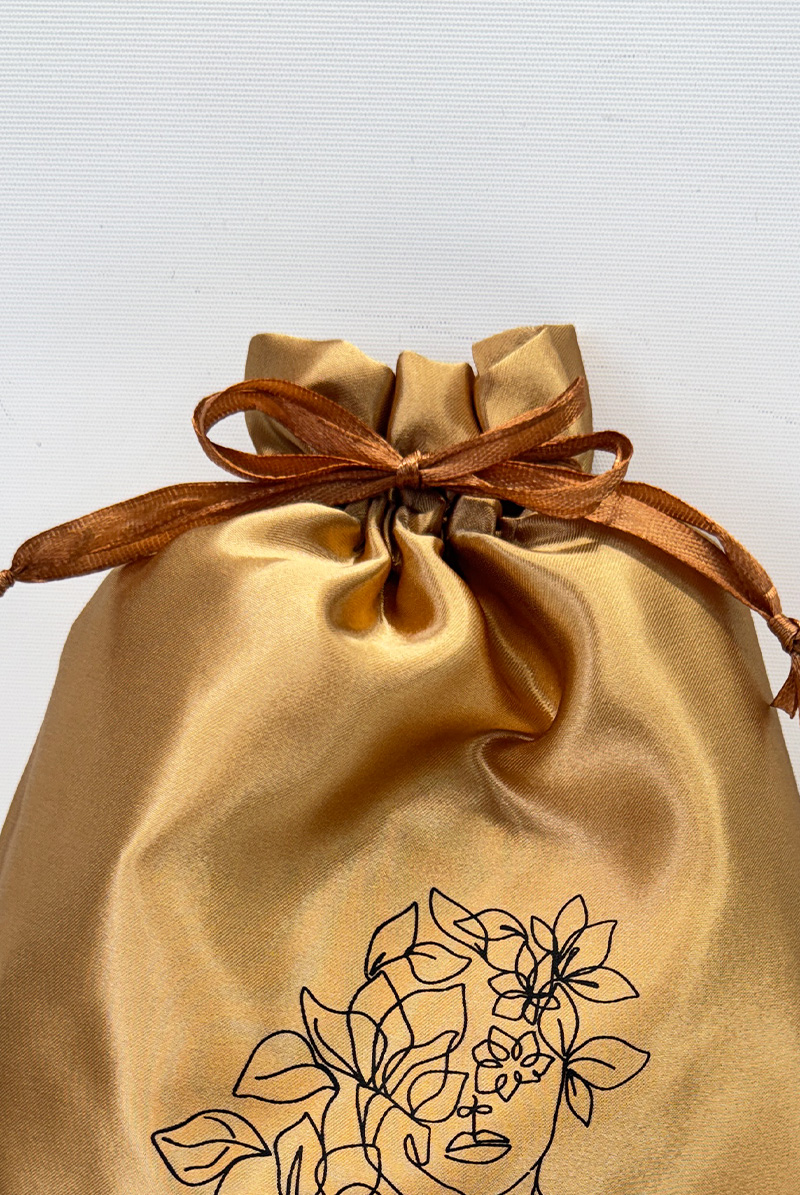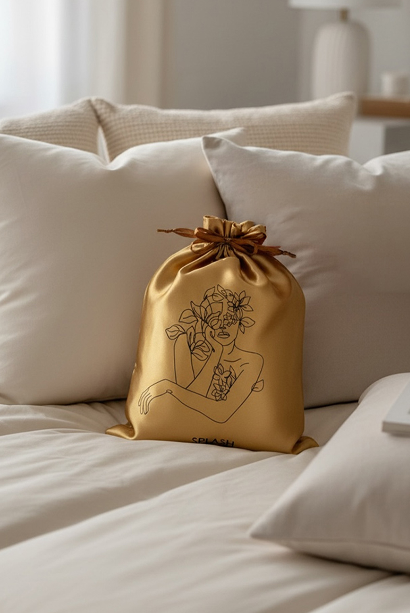 当店オリジナルトラベル巾着ポーチ。 なめらかな光沢を放つサテン調の生地に、繊細なラインアートをあしらった洗練デザイン。持つだけで、さりげないエレガンスを演出します。 ランジェリーやインナー、小物類の整理にちょうど良いコンパクトサイズ。バッグの中でもかさばらず、すっきりと収まります。 ドローストリング仕様で開閉もスムーズ。中身が見えないため、ギフトにさりげなく添えるアイテムとしてもおすすめ。気軽なプレゼントに、ささやかな特別感をプラスしてくれます。 日常にも旅にも寄り添う、上質な一枚です。