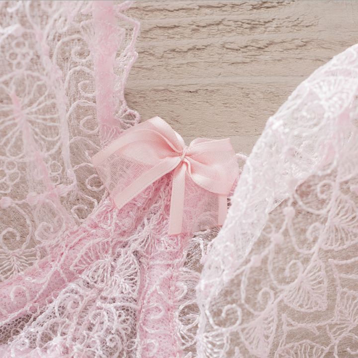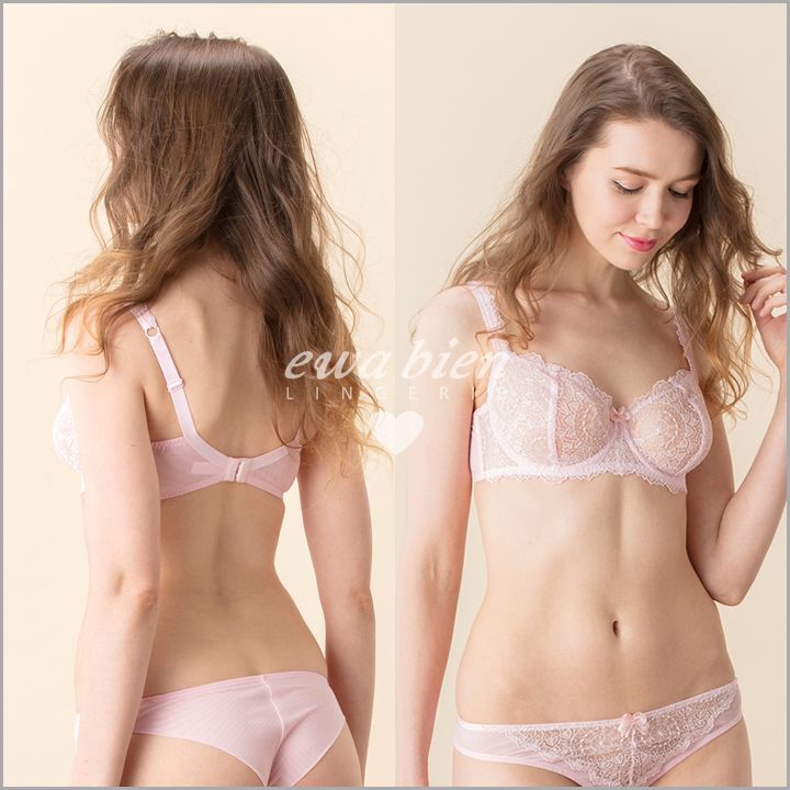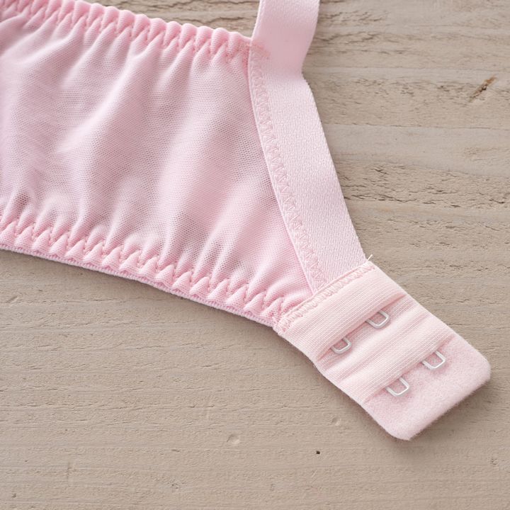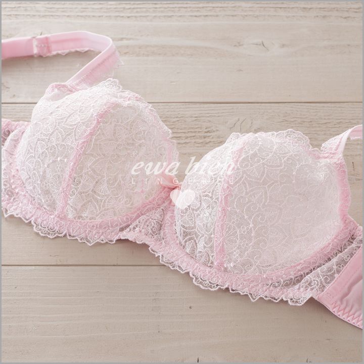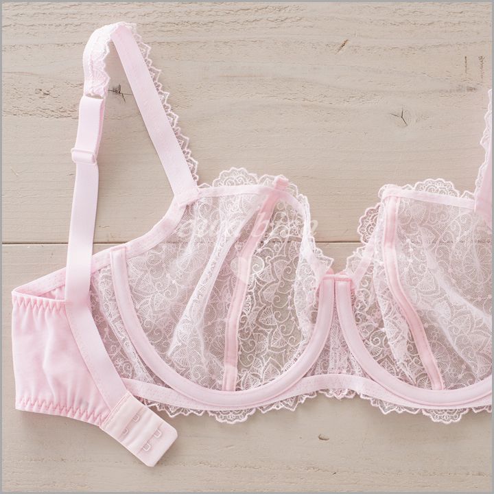 繊細で華やかな刺繍レース仕立ての一枚レースブラジャー。軽く清涼感のあるベビーピンクは華やぎにあふれ、清潔で上品な女性らしさを際立たせます。ブラジャーのカップはレース1枚仕立て。レースのみなので余計な厚みもなくクッションパッド付きカップや寄せ上げ効果の高いブラジャーが苦手な方にもおすすめです。レースには伸縮性がありませんが二枚はぎの立体感あるカップでバストをしっかり包みます。まるで花冠のような華やかなレースが肌を透かしながら美しさを際立たせる大人の総レースブラジャーです。※ブラジャーのカップは肌が透けます。透ける素肌の美しさをお楽しみください。
