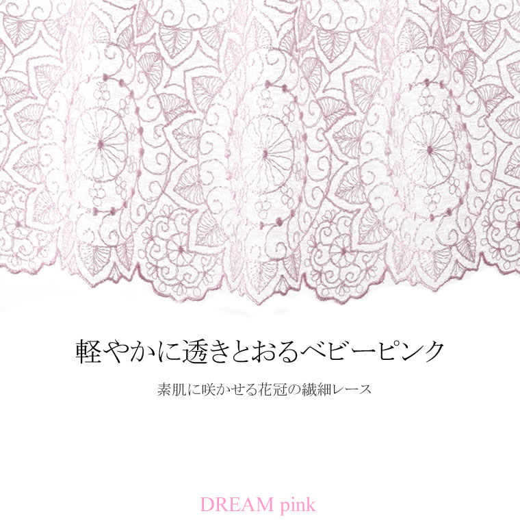 華やかなフラワー刺繍と繊細なレースの「DREAM pink」。透明感のある清涼ピンクが通り抜ける風のように軽やかに紡ぎます。素肌にのせればまるで花冠のようにナチュラルな美しさを引きだす新作コレクションです。