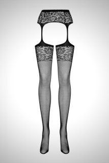 ガーターベルトと網タイツが一体化したサスペンダー網タイツ。小さな網目(フィッシュネット)と優美なレース模様が特徴です。ガーターベルトなしで着用でき、コーディネートにスマートなシルエットと統一感をプラスします。 大きすぎない模様が足元を細く見せ、太ももの近くには甘い縁取りのレースを配置。 ウエストとバックには大輪の花が密やかに咲き誇り、魅力的なボディに優美なアクセントが加わります。 タイツ部分はシンプルにフィッシュネットのみ。デイリーユースに使えるレッグ・ランジェリーです。