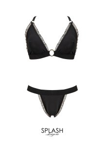 チュールレースが素肌をエロティックに透かすブラジャーとタンガ、レッグガーターのセット。グロッシーなストラップをデコルテや腰、太ももなどに配し、シンプルなスタイルをハードにスパイスアップしました。ゴールドの金具も存在感を放つボンデージ風のスタイルはパートナーを圧倒したい夜に最適です。 リング状の金具が妖しく輝くダークでスタイリッシュな後ろ姿も必見。X字にデザインされたストラップがヌードな背中を官能的に彩ります。ストラップは微調節ができ、体型に合った美しい着こなしが可能。スパイシーななかにもアーティスティックな感性が光るランジェリーをお楽しみください。