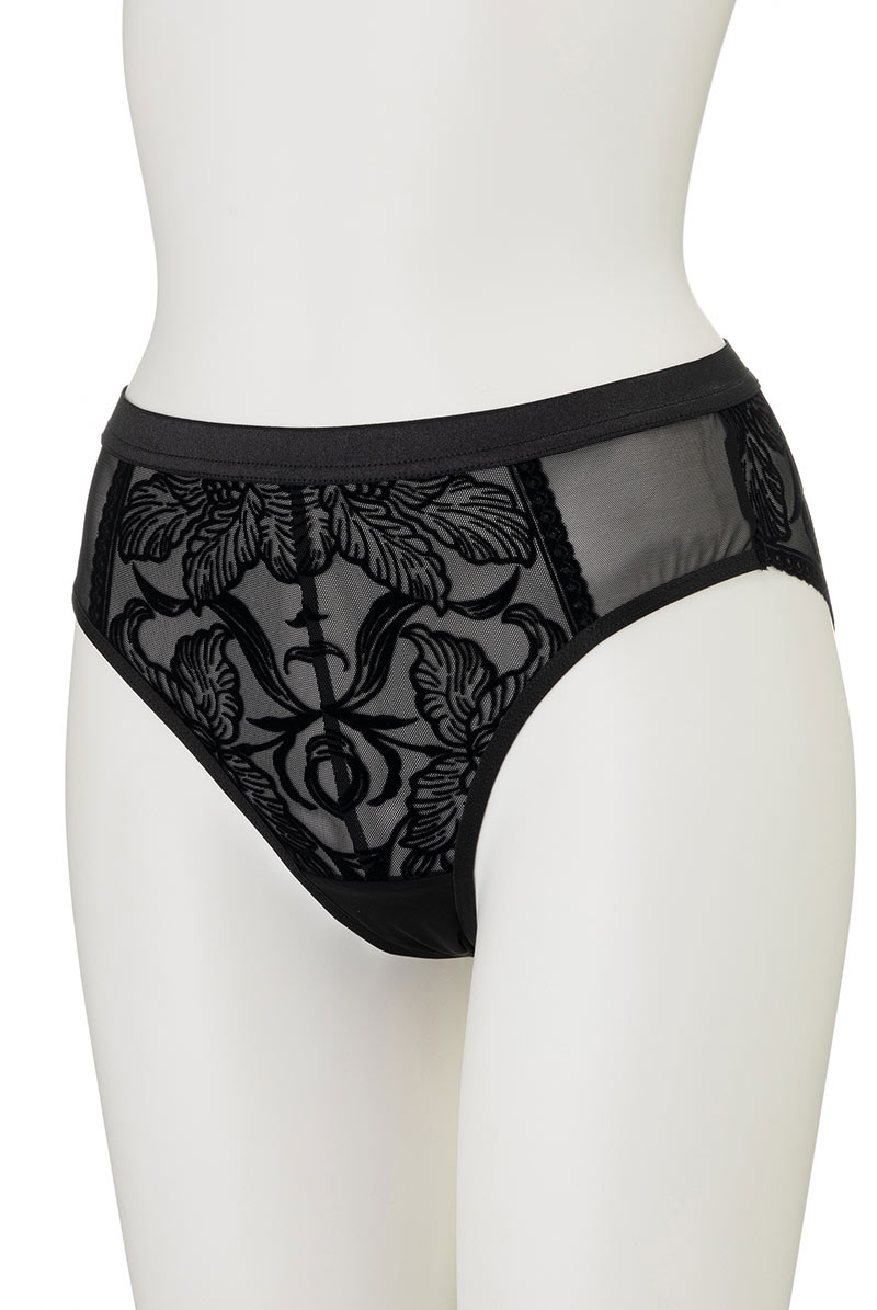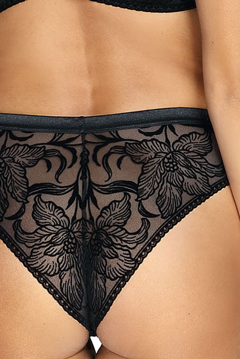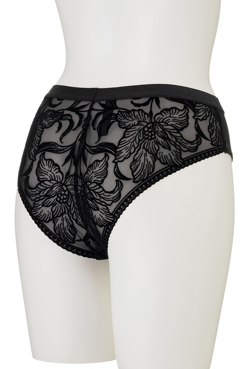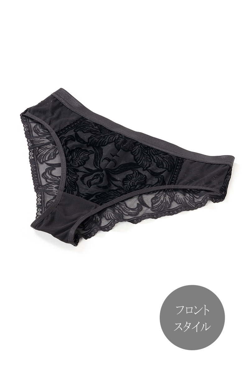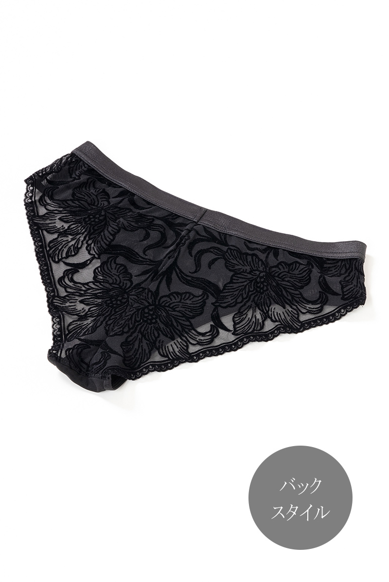 透明度の高いチュールレースにベルベット調のボタニカル模様を乗せたブラジリアンタンガ。黒の陰影で素肌をタトゥーのように飾るセンシャルなルックスが魅力です。サイドを透かすレースやサークル模様を描くピコレースもデザインポイントに。線画のようなユニークな花々で大胆に身体を彩るインポートならではのデザインをお楽しみください。 大輪の花々が咲き誇る躍動感のある後ろ姿も必見。ヒップを覆い切らないパターンがヘルシー&セクシーなバックスタイルをかなえます。ブラックのみで女性を艶やかに演出するラグジュアリーなランジェリーで極上のひとときを。