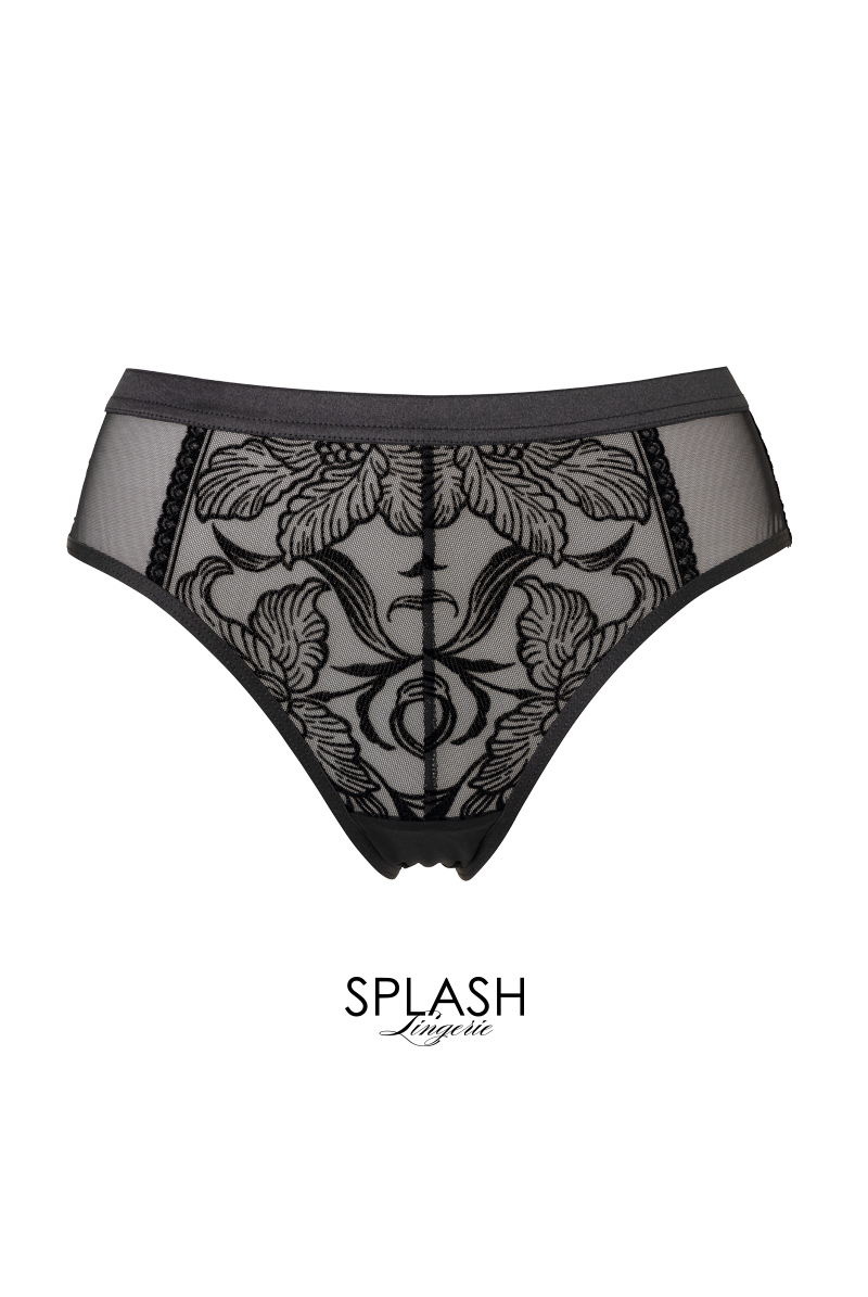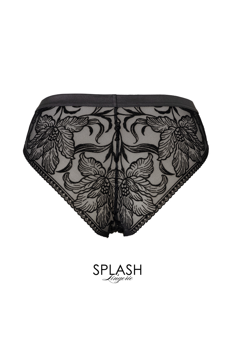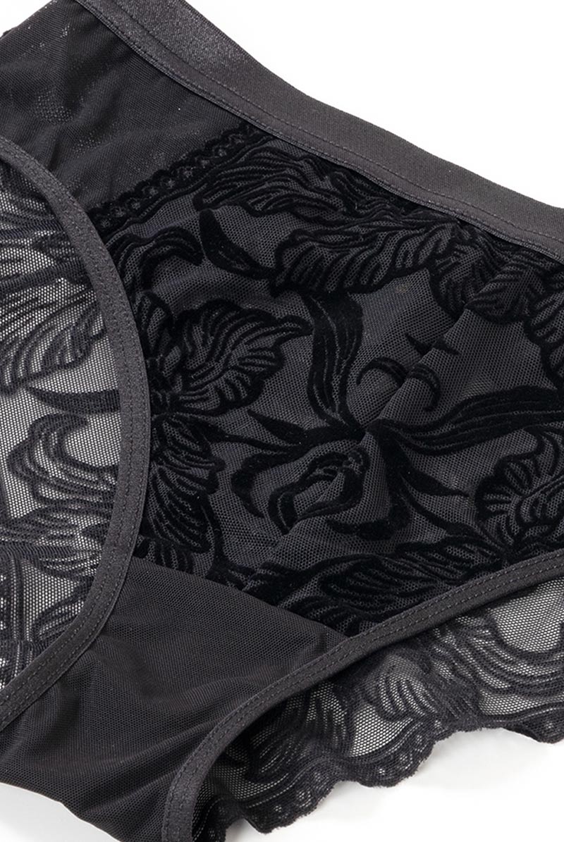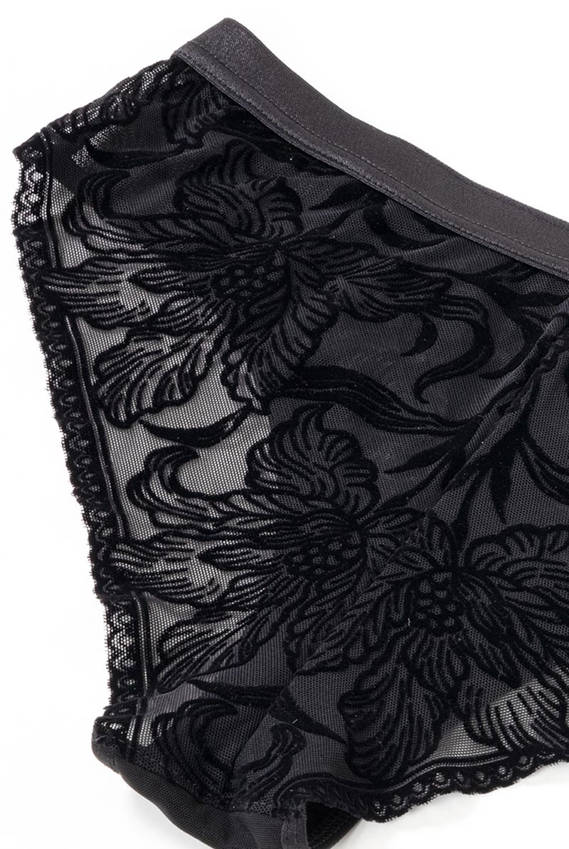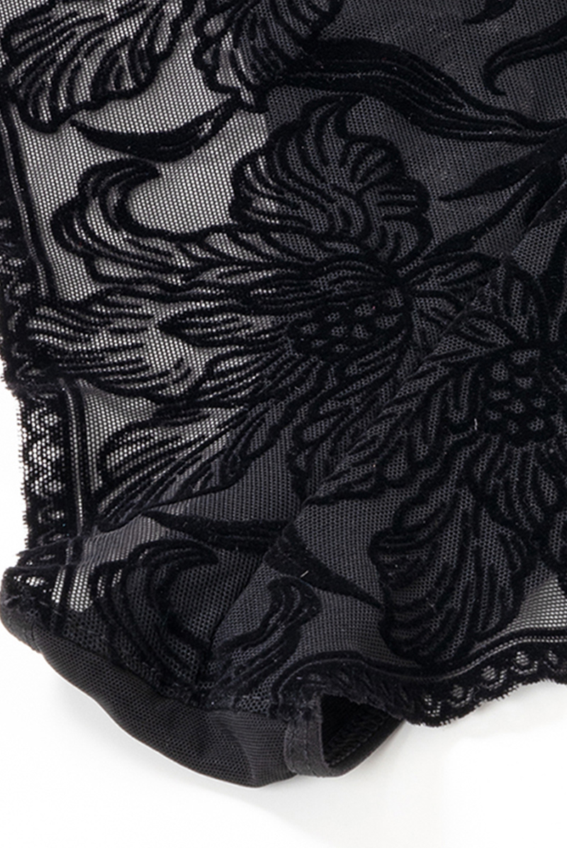 透明度の高いチュールレースにベルベット調のボタニカル模様を乗せたブラジリアンタンガ。黒の陰影で素肌をタトゥーのように飾るセンシャルなルックスが魅力です。サイドを透かすレースやサークル模様を描くピコレースもデザインポイントに。線画のようなユニークな花々で大胆に身体を彩るインポートならではのデザインをお楽しみください。 大輪の花々が咲き誇る躍動感のある後ろ姿も必見。ヒップを覆い切らないパターンがヘルシー&セクシーなバックスタイルをかなえます。ブラックのみで女性を艶やかに演出するラグジュアリーなランジェリーで極上のひとときを。