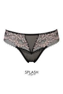 しなやかな質感のチュールレースと淡いピンクのフローラルレースが素肌を透かすショーツ。大輪の花々や曲線的な模様でセンシャルかつ大胆にボディを彩ります。脚繰りには格子状のレースを配しポイントに。インポートならではの華とエレガンスを極めたブラックランジェリーは必見です。 イタリアンレースで艶やかに魅せるフロントに対してバックはチュールレースのみを使ったシンプルなデザイン。空気のように軽いフィッティングに加えてブラックのトリミングが効いたスタイリッシュ&セクシーな後ろ姿もぜひお楽しみください。